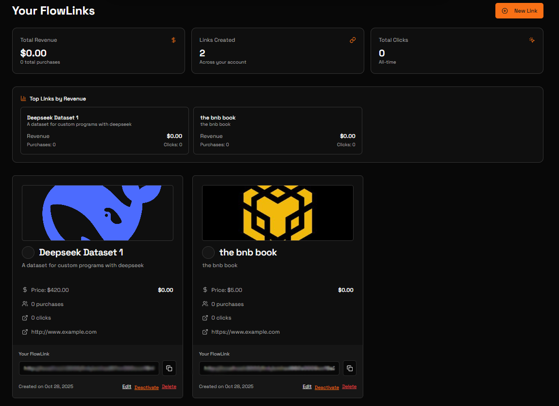 Paste any URL you want to paywall, set a price, and generate a unique FlowLink.